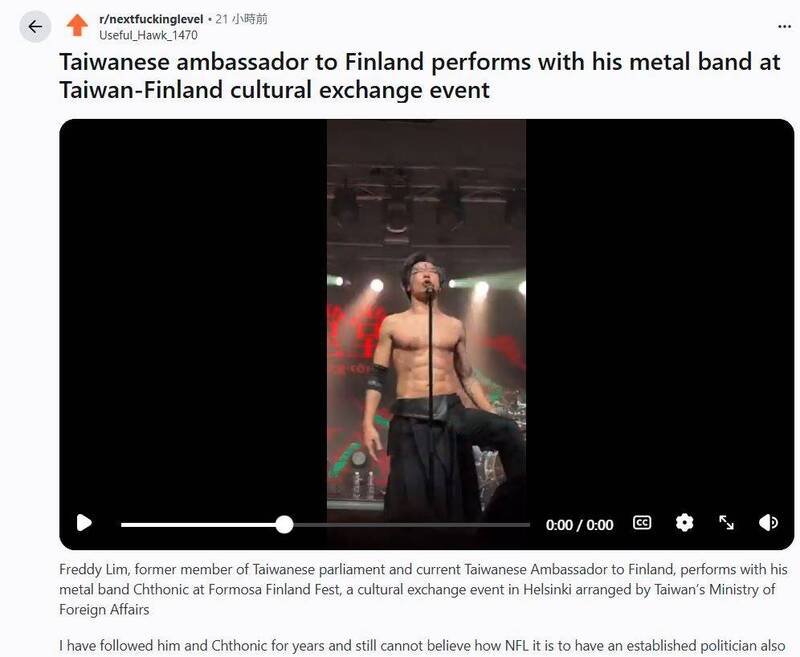 27日,駐芬蘭代表林昶佐率領閃靈樂團在芬蘭音樂節上登台表演,相關影片在網路上引起廣泛關注,特別是在Reddit「超狂版」(r/nextfuckinglevel)上,吸引超過5萬人點讚
